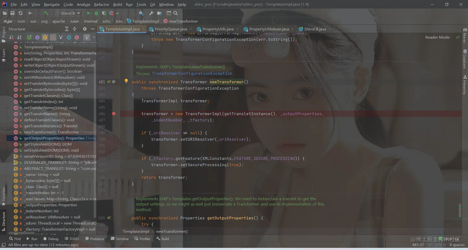 根据上面的流程图我们可以知道TemplatesImpt类的危险方法是getOutputProperties(),我们从头开始调试。