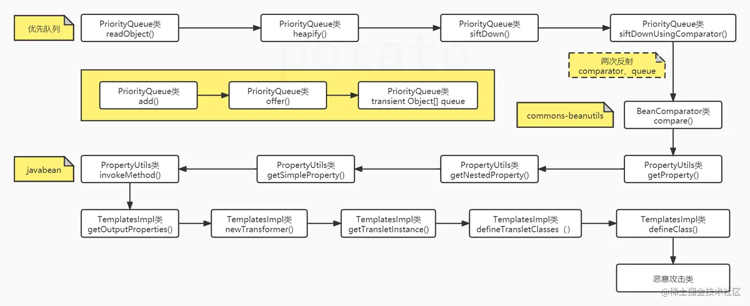 接下来我们的走向很清晰明了,首先我们通过add添加数据,之后做两步反射,最终执行BeanComparator.compare(TemplatesImpl,1),之后触发PropertyUtils.getProperty,通过写好的_name、_bytecodes执行TemplatesImpl的getOutputProperties()。