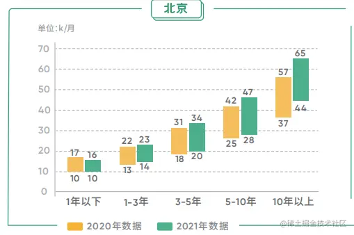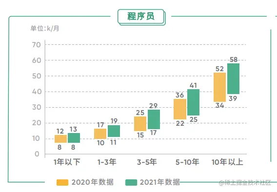 与 2020 年平均薪酬相比,2021 年程序员岗位则是 1-3 年、3-5 年 及 5-10 年平均薪酬涨幅相对较明显,而且随着技术经验的积累,薪资涨幅更大。虽说我们看到前段时间大厂纷纷裁员事件和程序员失业转行的“噩耗”,但程序员类岗位依旧是在各阶段都急需人才。