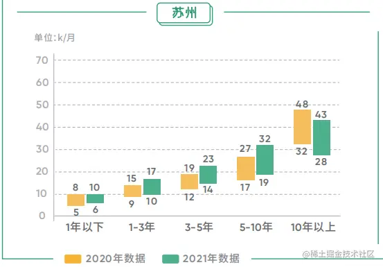 这里有个很明显的点,苏州 10 年以上的程序员岗位薪酬下降了 10% 左右。其原因诸多,这里不展开说明。