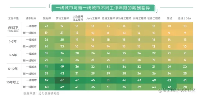再来看一线及新一线城市不同岗位程序员平均薪酬随资历的变化,刚从业者差异相对不明显,但随着工作年限的增加,薪酬间的差异开始逐渐显现,对于有 3 年以上经验的程序员来说,这个差异超过 10% 。3 年以上经验的后端工程师、软件工程师及运维的薪酬,一线城市比新一线城市薪酬高出 10%-50% 不等。最近两年受疫情和经济的影响,返乡潮大量涌现,是需要慎重考虑选择建设家乡还是选择去一线拿高薪,你们自己决定~