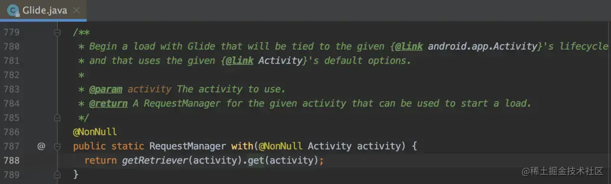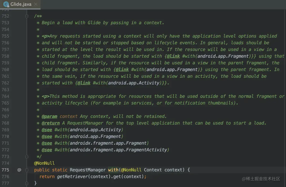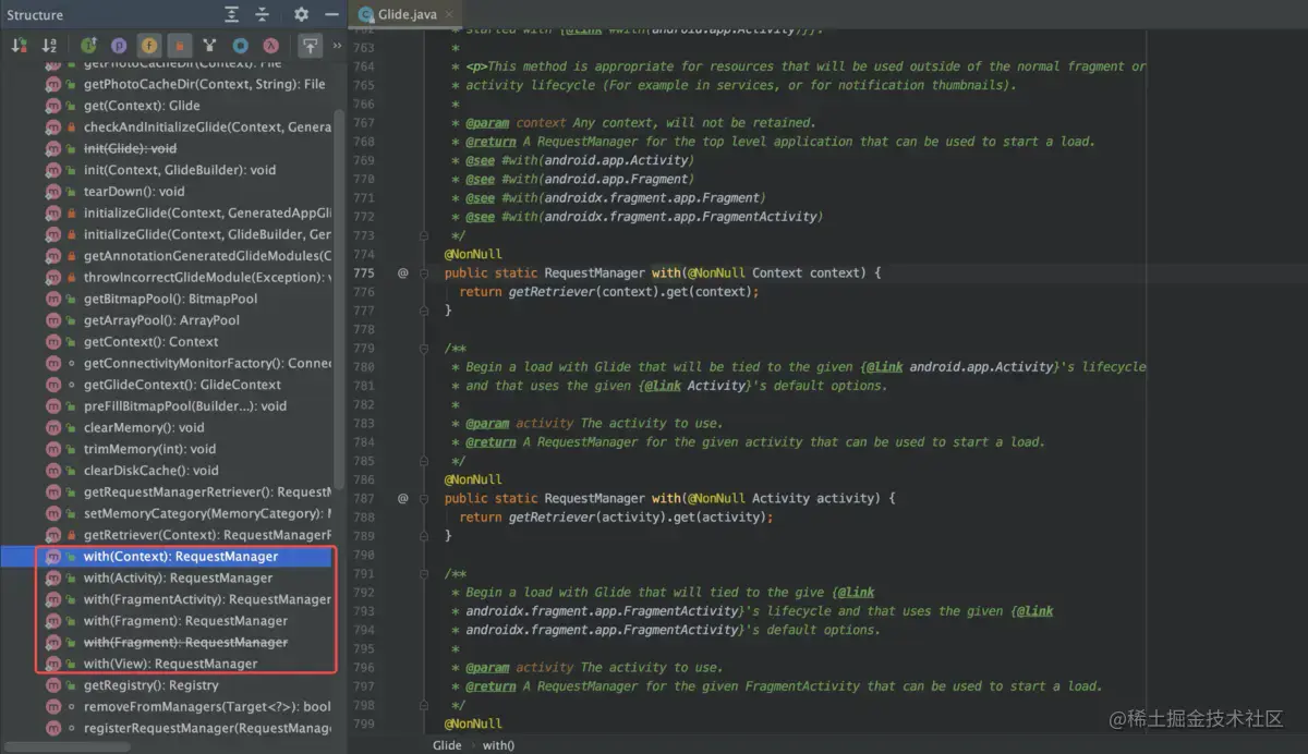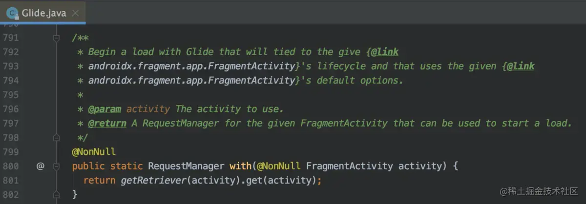 我们先讲讲 Glide 的生命周期控制,也就是 Glide.with 方法,让我们简单看一下里面的源码