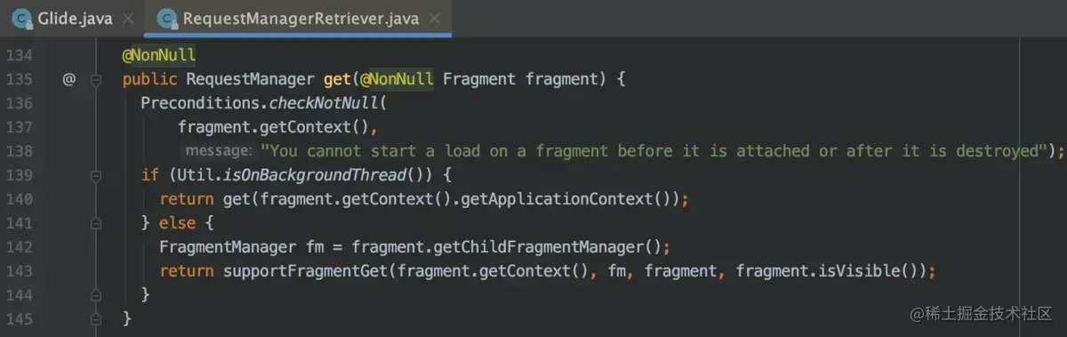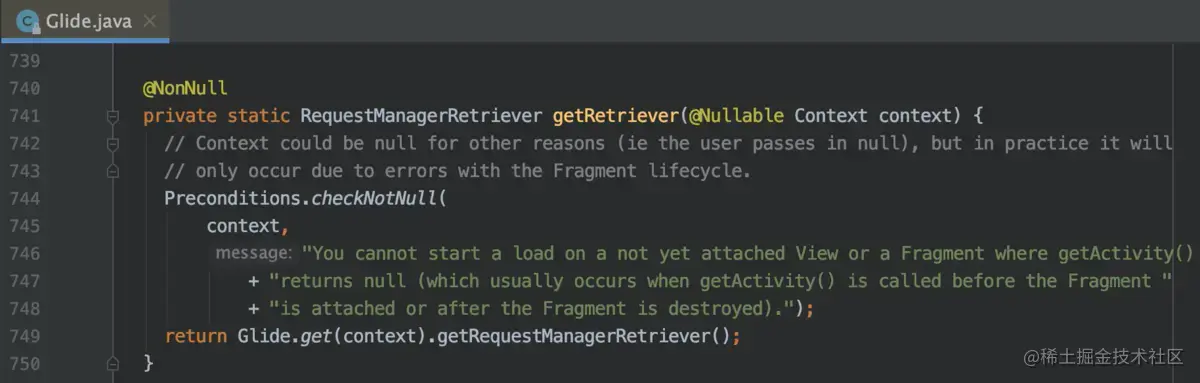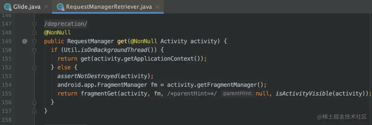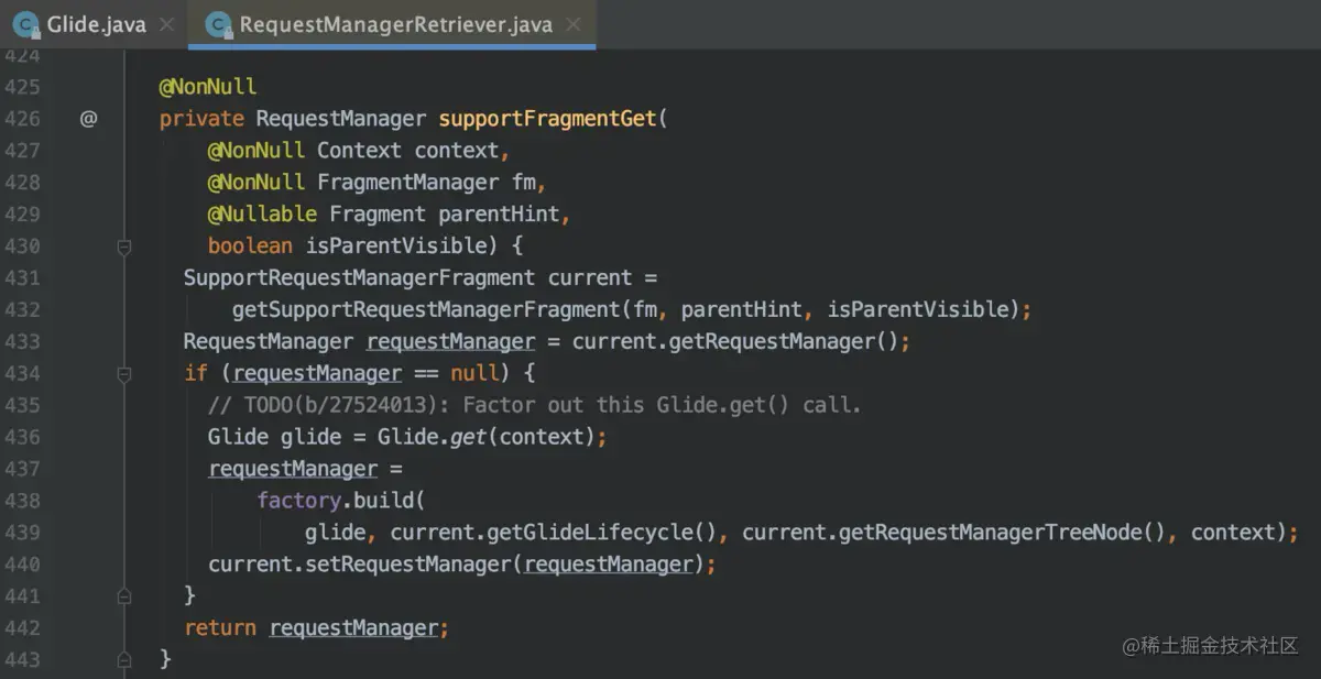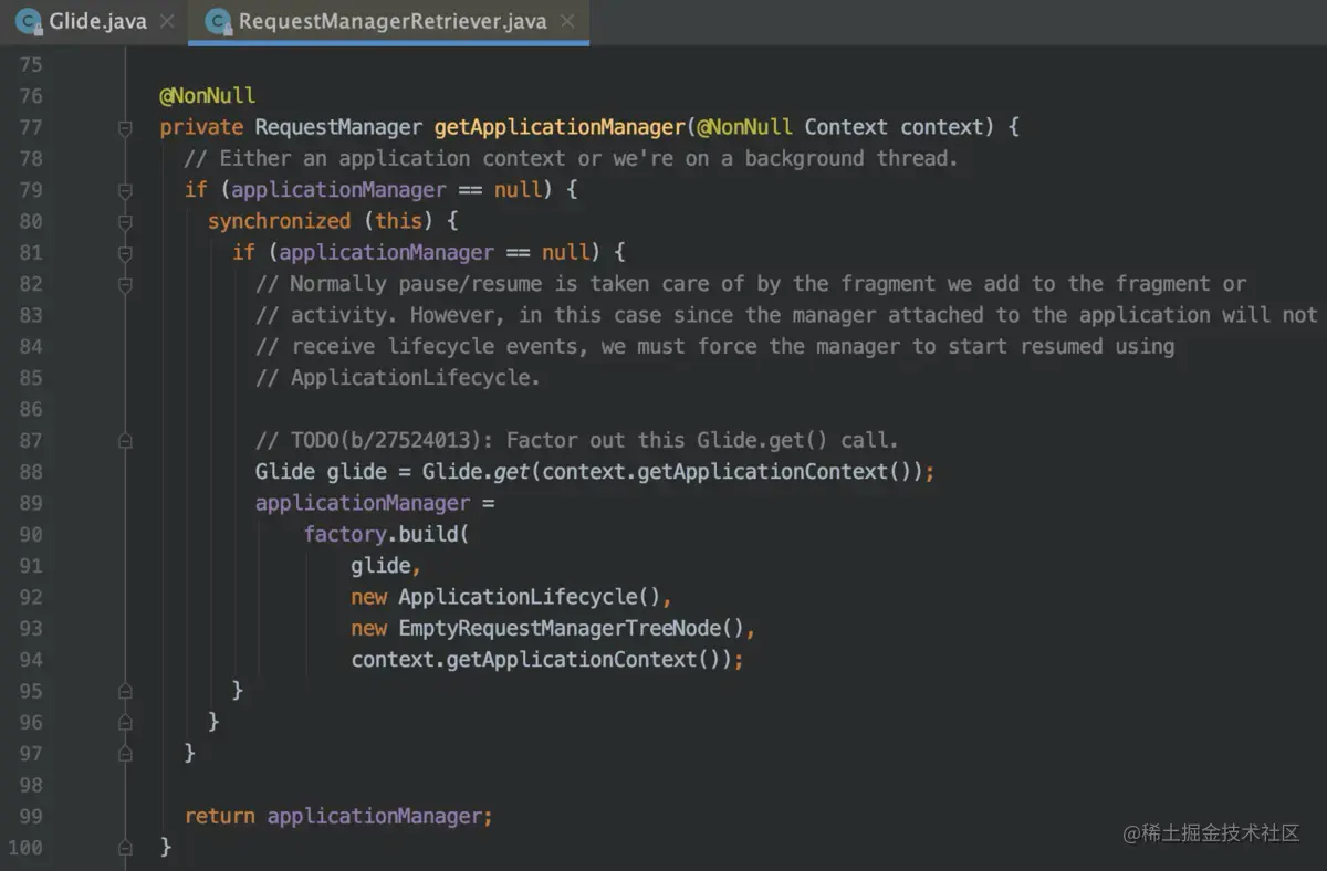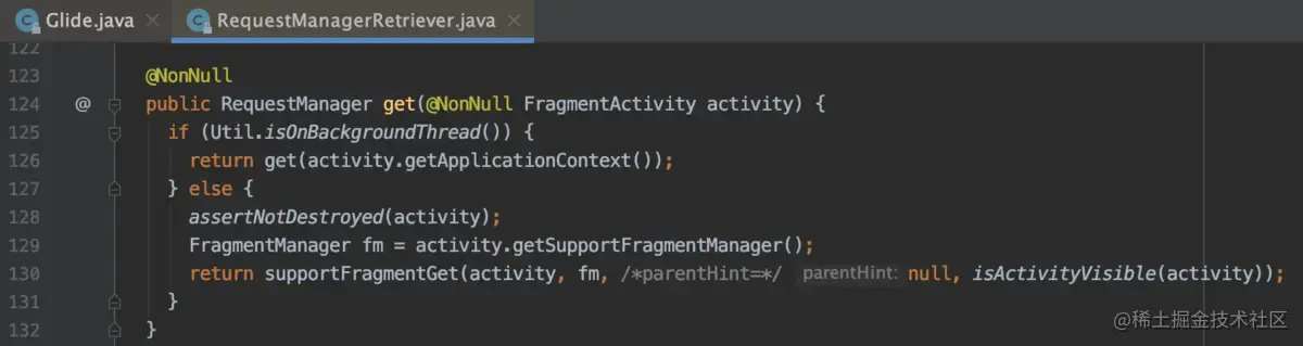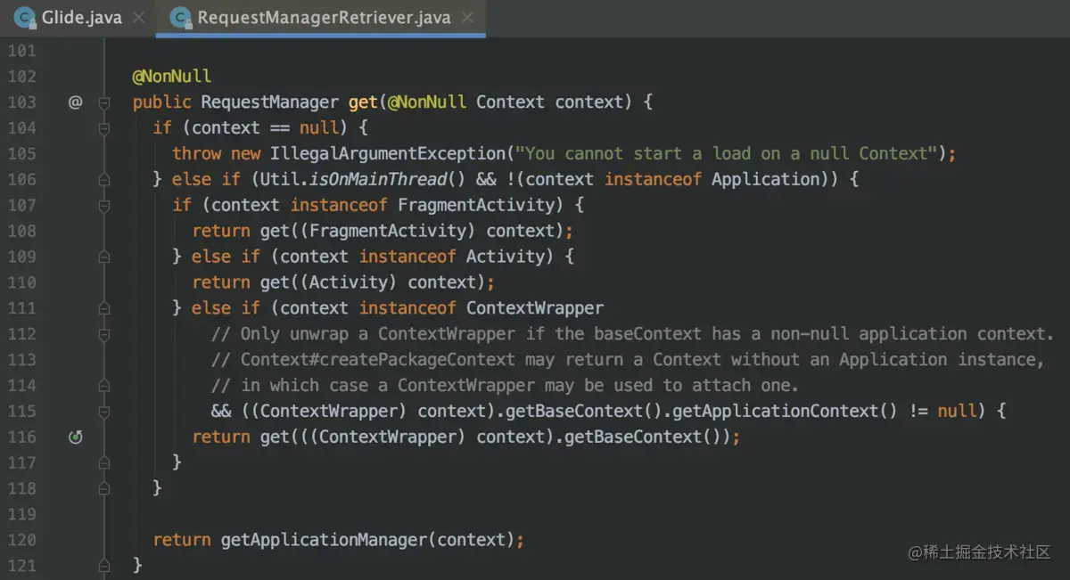 - 分析上面的源码,我们可以知道,你如果给 Glide 传入的是一个 Context 对象,它会自动推导 Context 的类型,究竟是 FragmentActivity 呢还是 Activity 呢,如果两种都不是呢?万一是 Application 的 Context 呢?接下来继续看源码