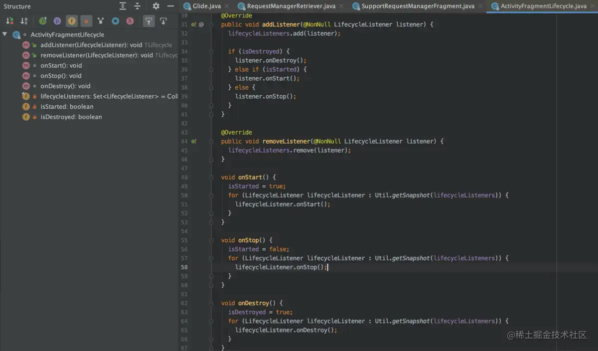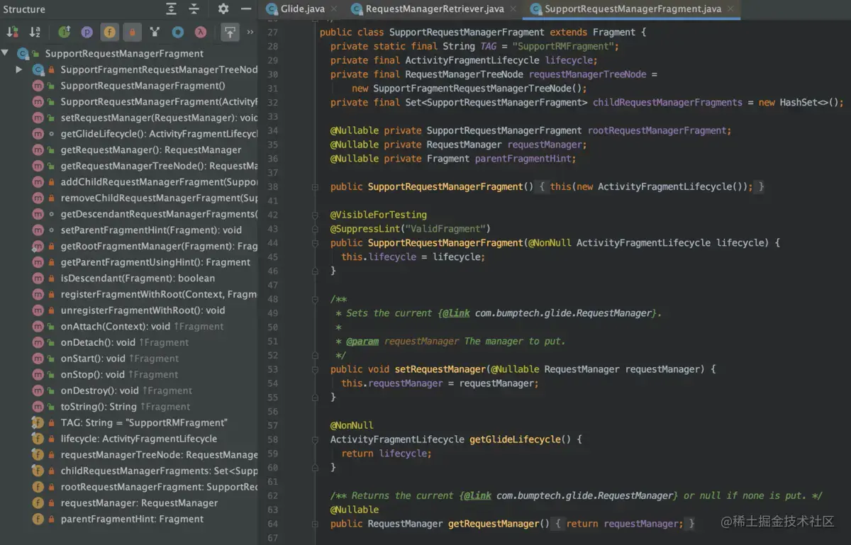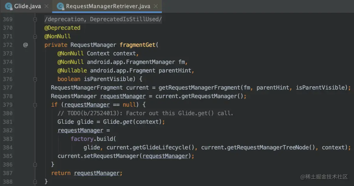 - 通过查看这几段源码,我们可以得出一个结论,Glide 拿到 FragmentActivity 的用处是为了在 Activity 里面创建一个 Fragment,那么问题又来了,它创建 Fragment 是要做什么事?接下来让我们继续追踪一下源码。
