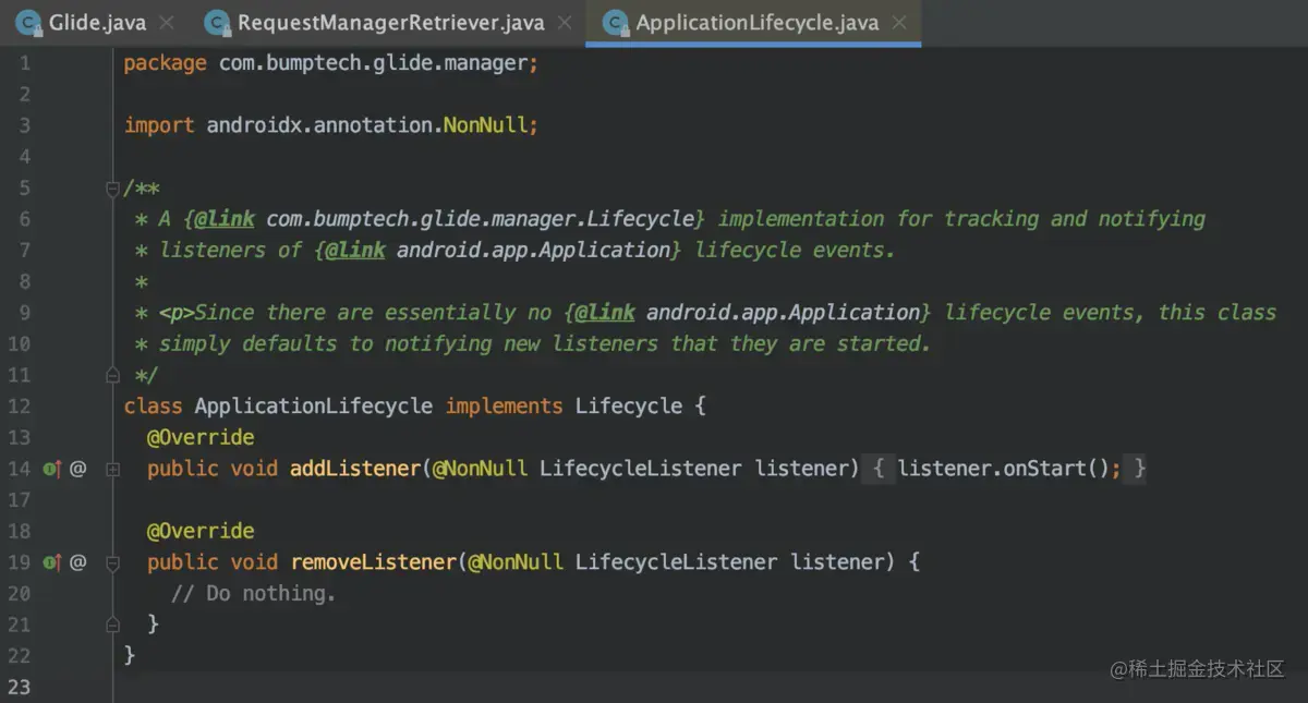 - 看到这段源码,我们又发现了一个 Lifecycle 类,只不过这次跟我们之前看到的 ActivityFragmentLifecycle 类不一样,因为它换了一个马甲:ApplicationLifecycle