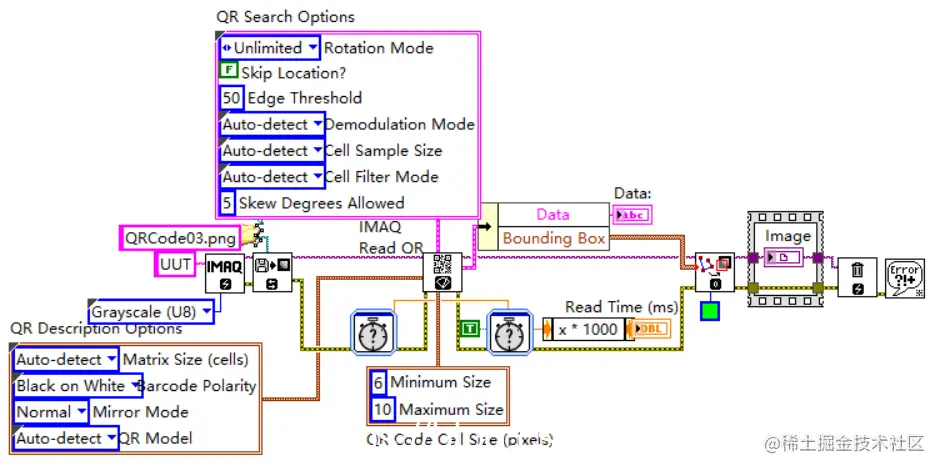 - 程序代码结构比较简单,在将包含QR码的图像读入内存后,就直接调用位于LabVIEW的视觉与运动→Machine Vision→Instrument Readers函数选板中的IMAQ Read QR Code函数,从图像中搜索单个或多个QR码并对其进行解码。
