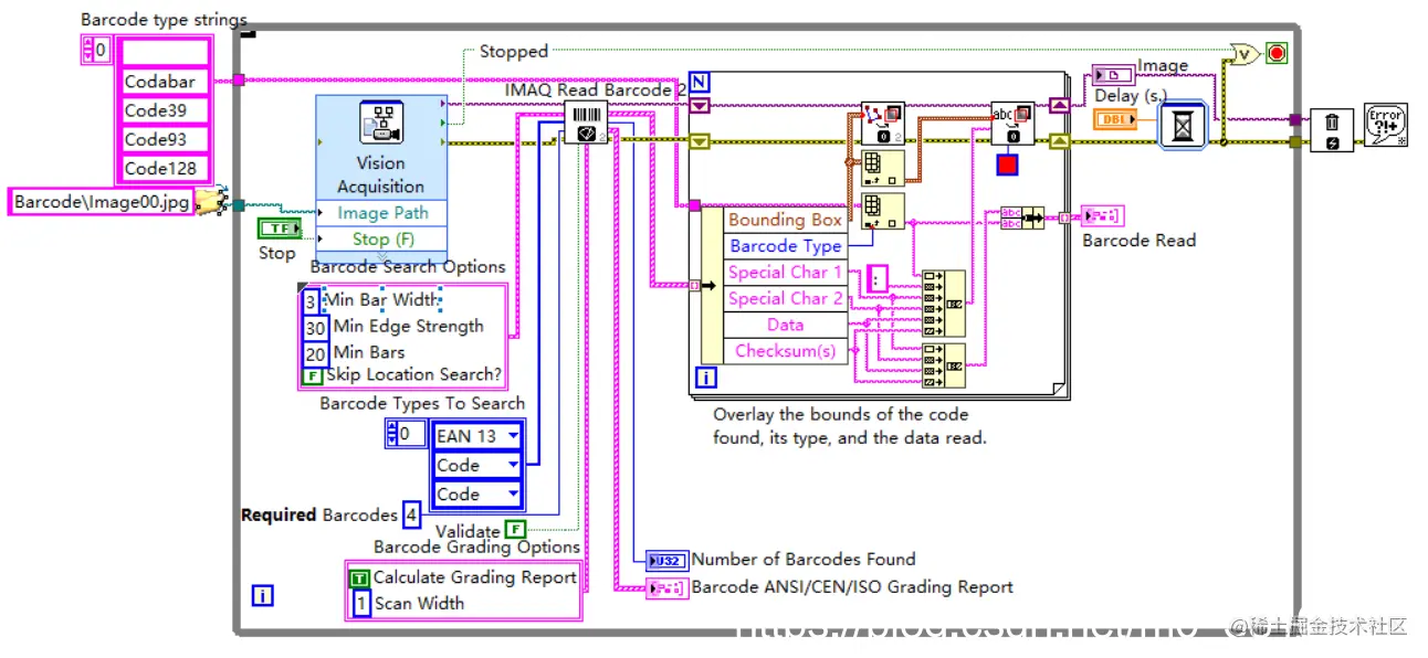 - While循环中的代码会逐一读取保存在Barcode文件夹中的各个图像,然后使用IMAQ Read Barcode 2从图像中搜索各类条码的位置,并对它们进行解码;