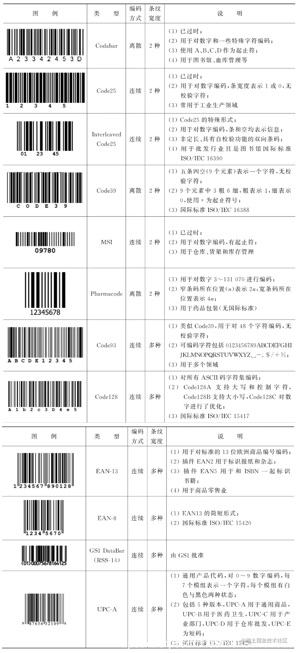 函数IMAQ Read Barcode 2可支持下表列出的各种类型的条码。