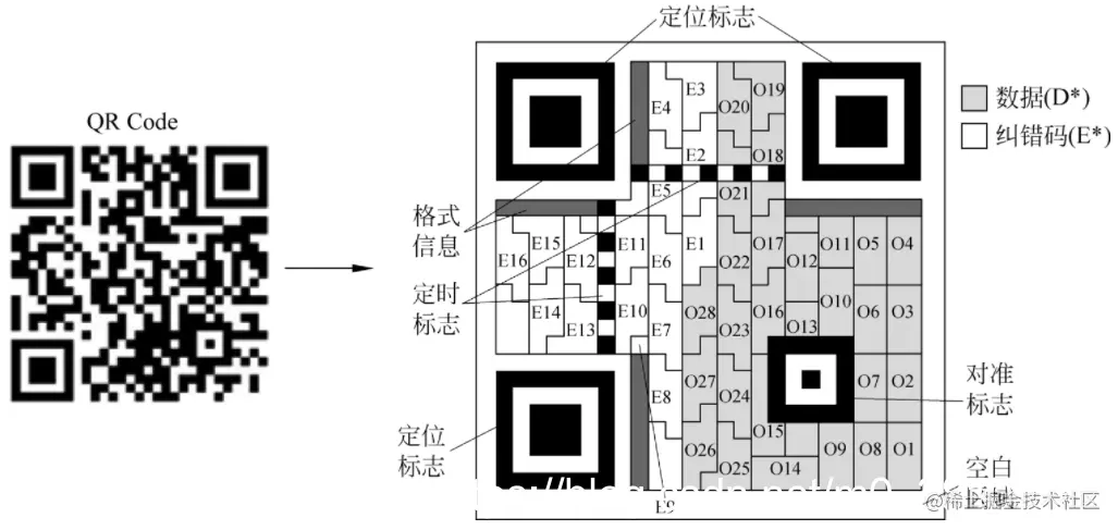 下图显示了QR码的典型结构示意图,可以看出QR码是一种典型的矩阵式二维码主要由以下几个部分构成: