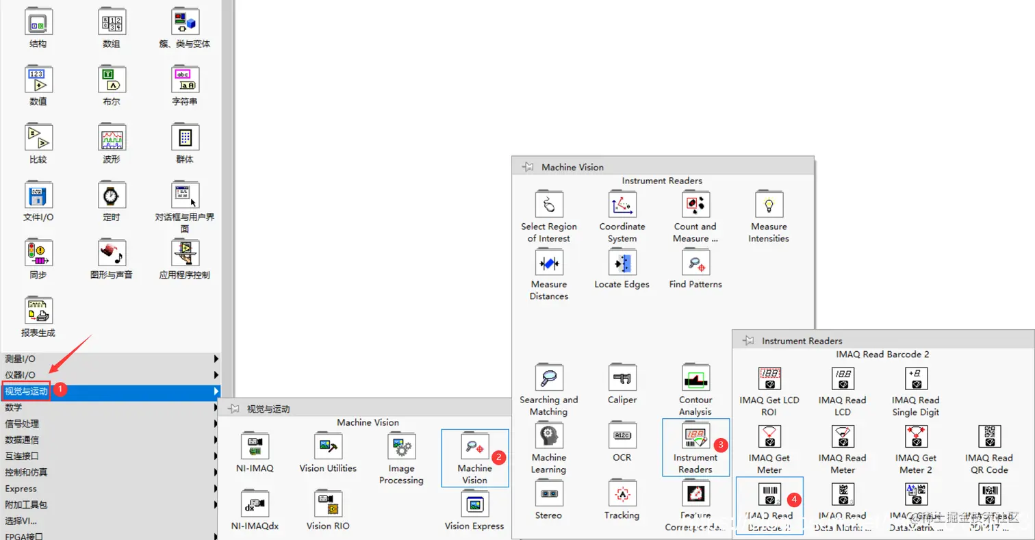 Nl Vision为一维码的读取提供了专门的函数IMAQ Read Barcode 2,它封装了对条码的复杂解码过程。该函数位于LabVIEW的视觉与运动→Machine Vision→Instrument Readers函数选板中,如下图所示: