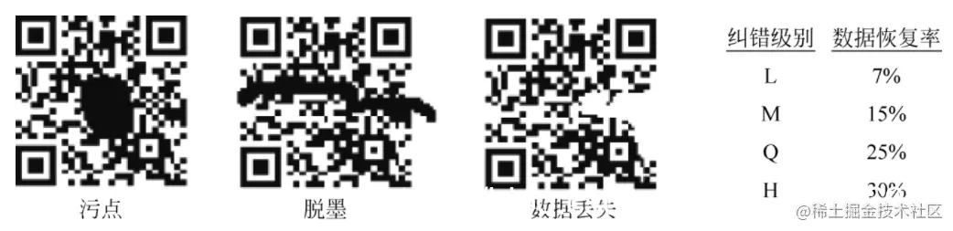 QR码是矩阵式二维码的一种,其尺寸可包含21×21到177×177个数据单元。由于其右下角有对准标志,其他3个角上有定位标志,因此可以从QR码的任一方向对其进行快速读取。QR码内置了错误检查和纠正(ECC)机制,它可以通过标准Reed-Solomon方案对污点、脱墨和数据丢失等条码损坏按照4种不同纠错级别(L、M、Q、H)进行恢复如下图所示。数据的恢复率随着所选的纠错级别不同各异(L级为7%、M级为15%、Q级为25%、H级为30%)。