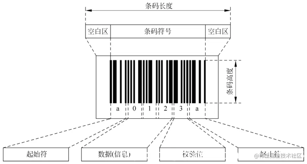 一维码将多个宽度不同的竖直黑色条纹(Bar)和空白(Space)按一定的规则排列来表示信息,下图显示了一维码的结构示意图: