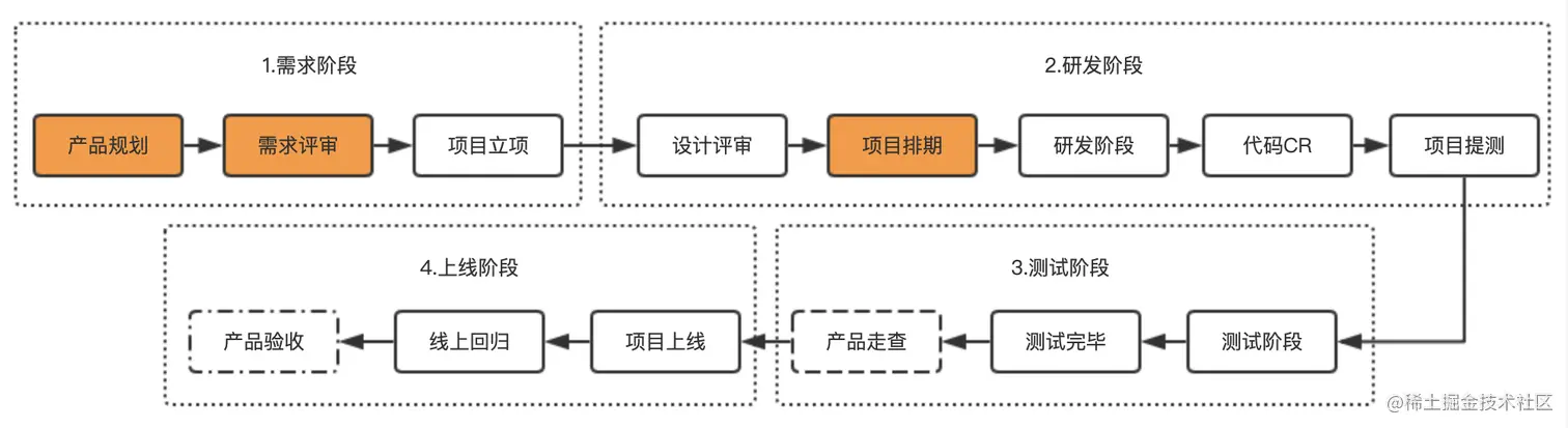 我把项目管理分为4个阶段,分别为需求阶段、研发阶段、测试阶段和上线阶段。