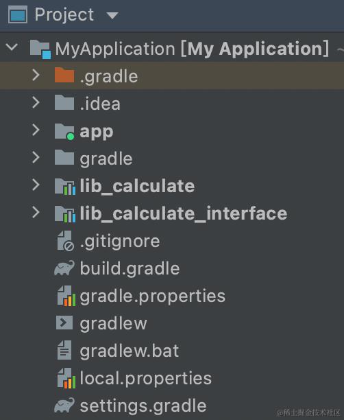 在组件化的实现方式下,我们需要将模块的功能抽象成一个接口模块,模块间的依赖只依赖接口层,而不依赖具体实现层,这样就达到了组件接耦的目的。如下所示:calculate模块抽象出了一个lib_calculate_interface模块,实现层在lib_calcualte中: