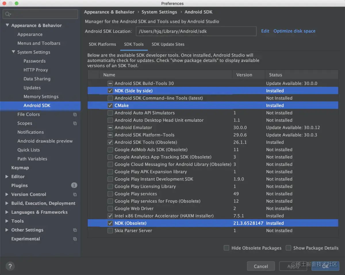 环境配置其实非常简单,安装 NDK 和 CMake 相关的包就可以了