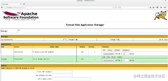 3、浏览器输入:http://serverip:port/manager/html,输入用户名和密码,此处的密码为 manager-gui 对应的用户名和密码;