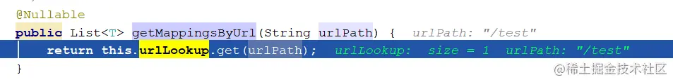 前端发起请求,断点停在了AbstractHandlerMethodMapping.MappingRegistry#getMappingsByUrl方法上,以前端发起的请求路径,从urlLookup上获取对应的值。