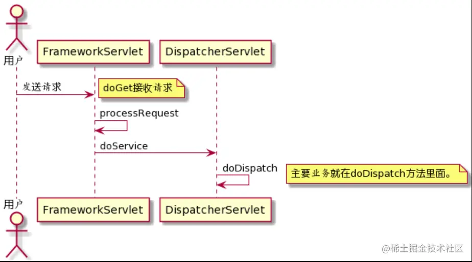 前端请求发过来,DispatcherServlet接收到(因为它是个servlet,配置在web.xml的),根据上一步处理好的映射关系,找到对应的方法来处理。