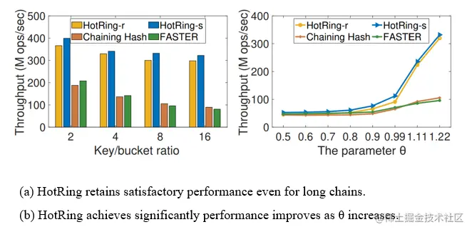 左图压测了链表长度对性能的影响,可以发现当链表长度从2一直递增到16的过程中。HotRing方案的性能几乎是恒定的,可以保持一个很好的性能。、右图表明hotring在数据访问呈现严重倾斜的情况下,也能保持非常好的性能。