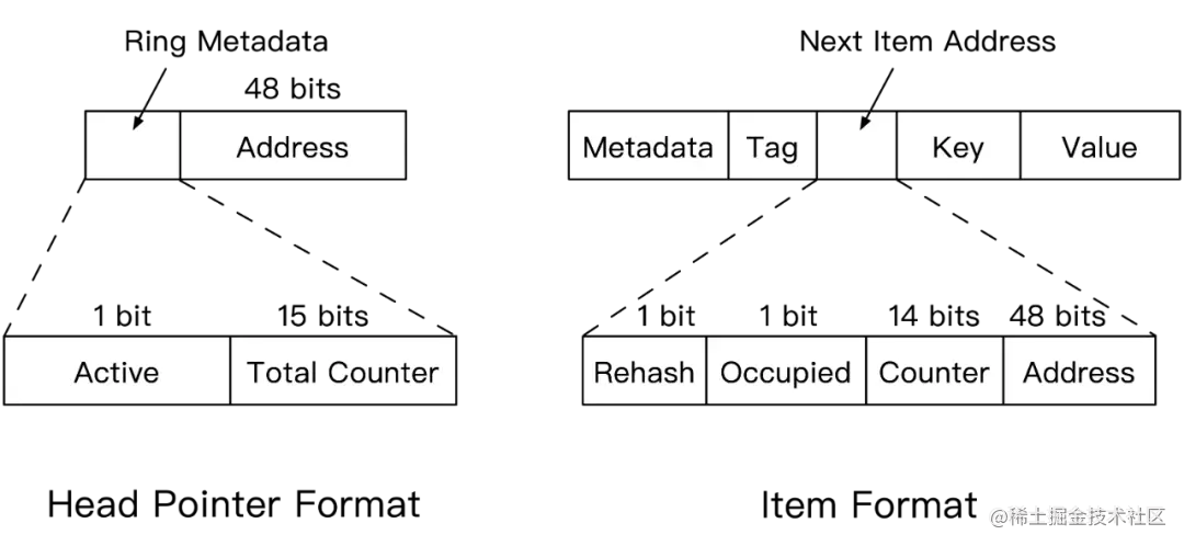 如图所示,在old Table中的一个旧头指针,相应地在new Table 中两个新的头指针。1个环会被拆成2个环。回到上述索引格式Metadata中,自然散列值k的bit数拓展到k+1(在计算机语言中乘2就是左移一位),则tag的bit数减少一位变为tag-1。根据这一位的值(即rehash bit),决定原有环中的项在哪一个新环上(和JDK HashMap类似)