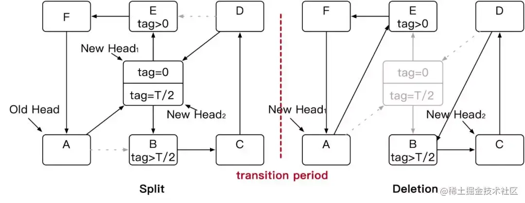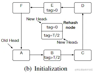 在初始化阶段,两个子重hash项的标记设置不同。如图所示,相应的rehash项将标签设置为0和T/2,分别为。