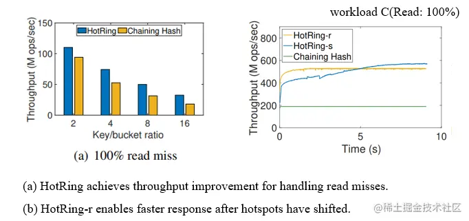 左图表明Hot Ring在read miss的情况下的性能比chaining hash的性能要好。这是因为Hot Ring中每一个桶的环是有序的,判断元素不存在不需要遍历桶中的所有元素。右图热点切换时,不同的热点选择策略稳定下来需要的时间,hotring-r在两秒内就可以达到一种稳定的状态了。