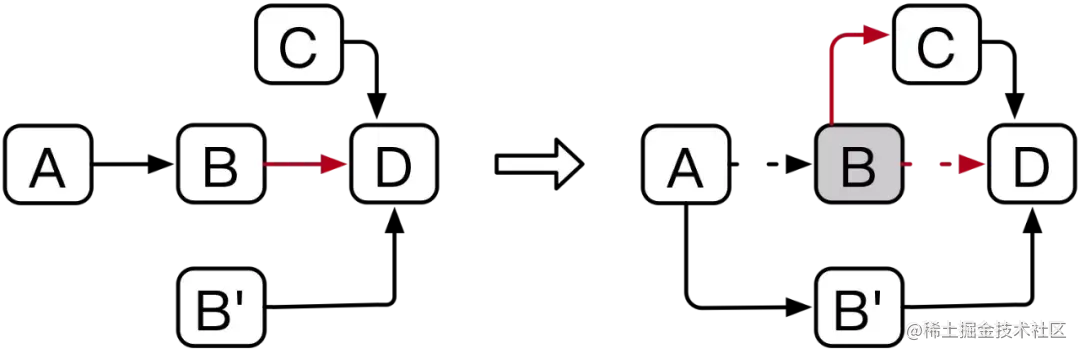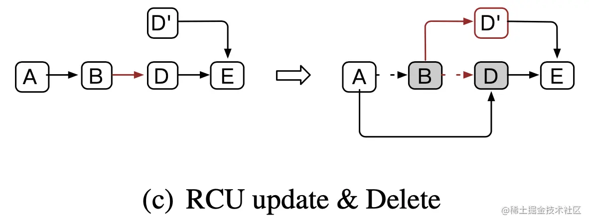 - RCU-update时,使用CAS连接前一个节点,发现B.next.occupy = 1,操作会失败,重试