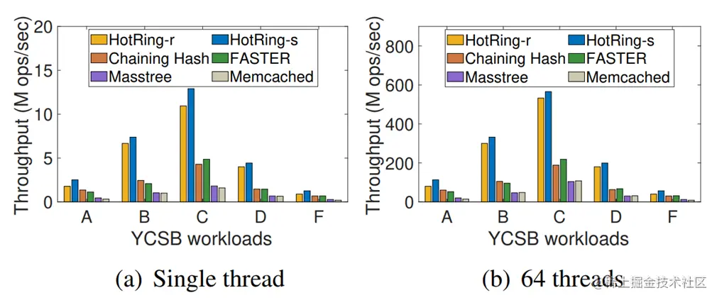 背景:论文中通过YCSB对HotRing方案进行了压力测试,并对比了行业有名的Memcached等。可以看到HotRing方案的吞吐量远超其他方案: