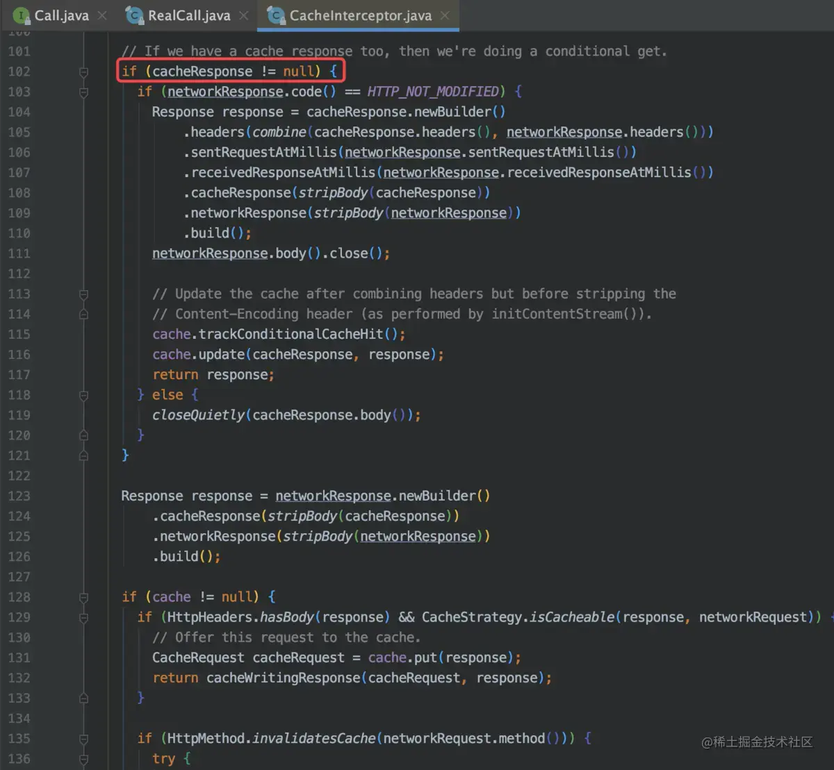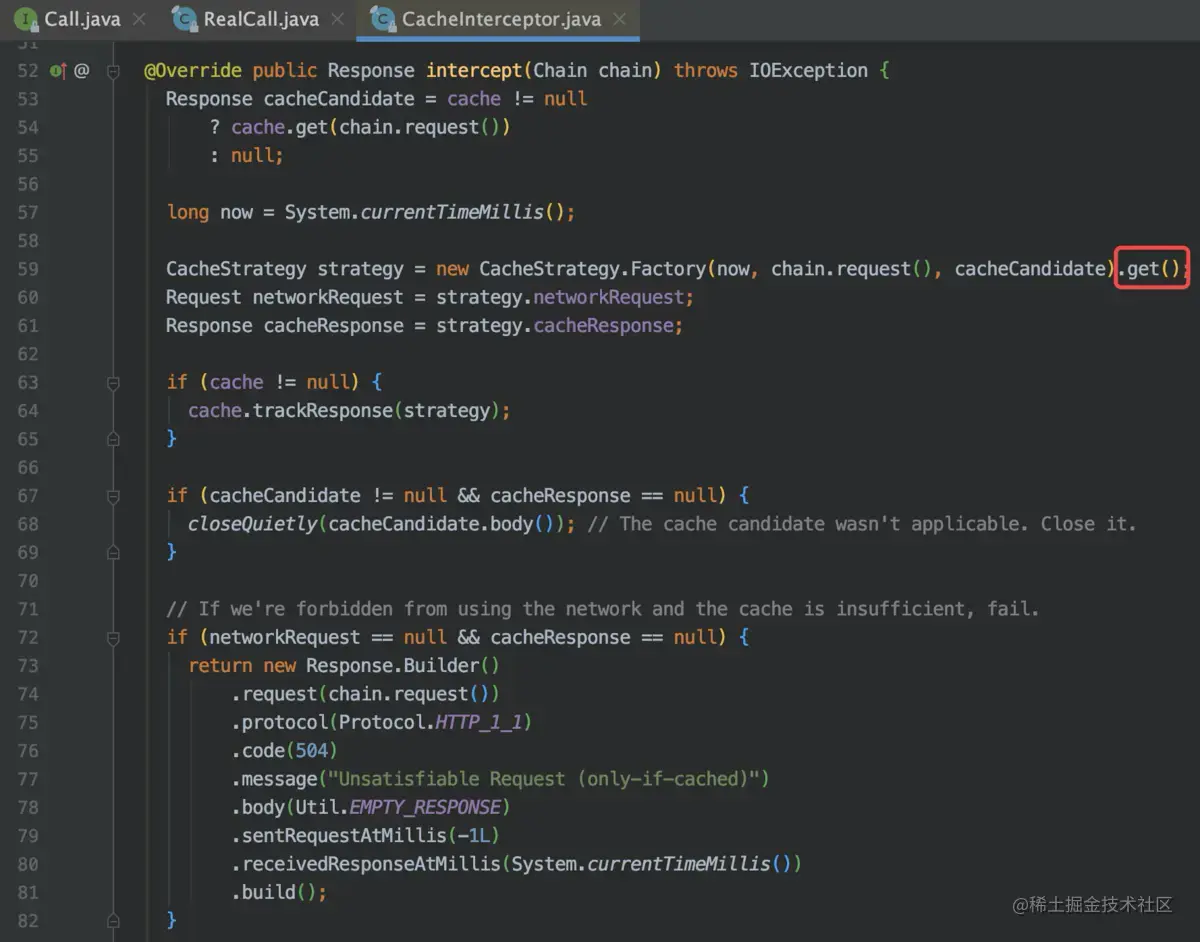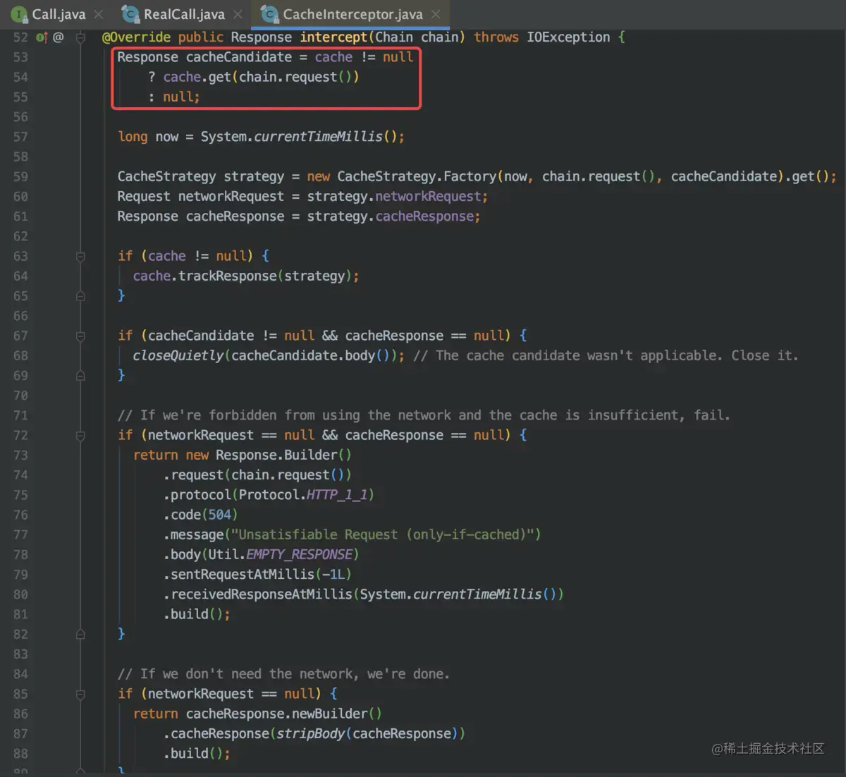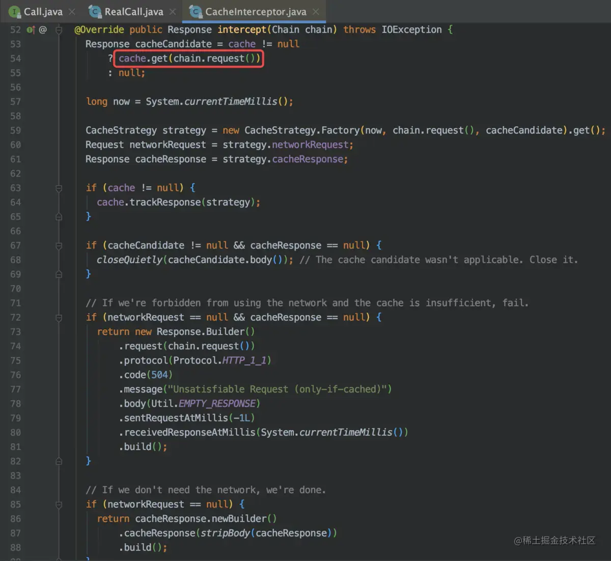 - 这个拦截器的作用正如它的名称一样,负责处理请求缓存的,接下来让我们看看这个拦截器是怎么处理缓存的
