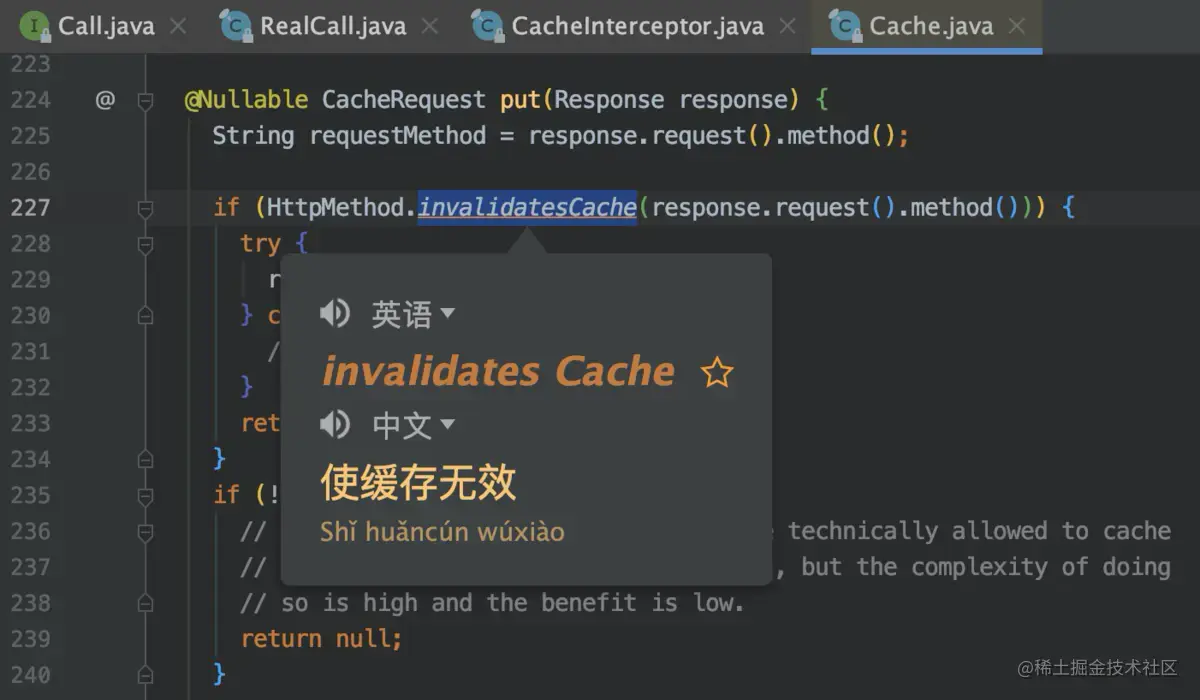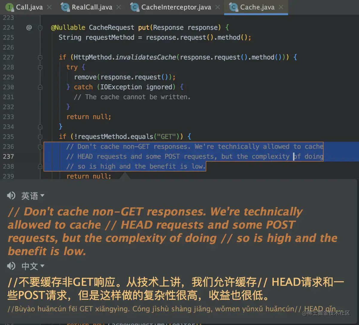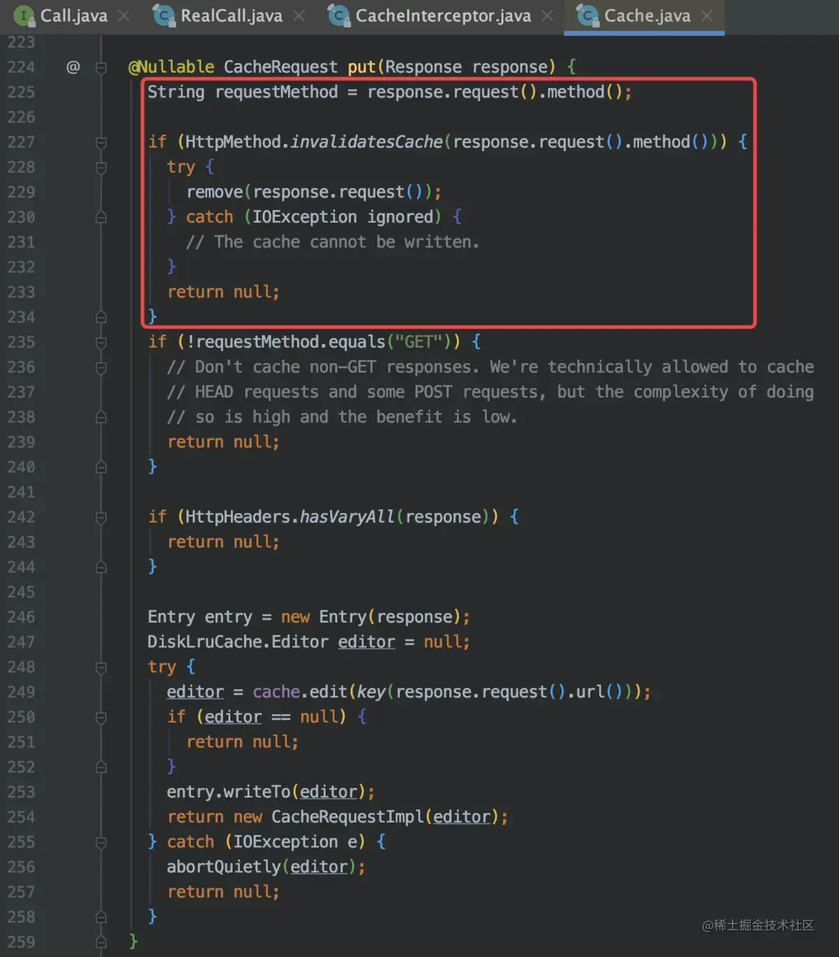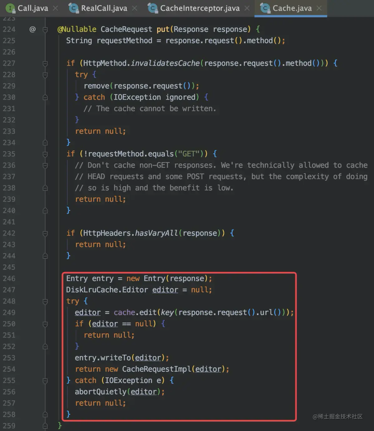 - 这个拦截器的作用正如它的名称一样,负责处理请求缓存的,接下来让我们看看这个拦截器是怎么处理缓存的