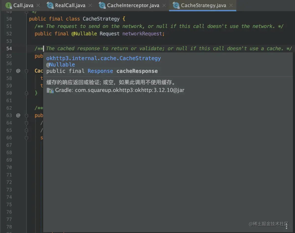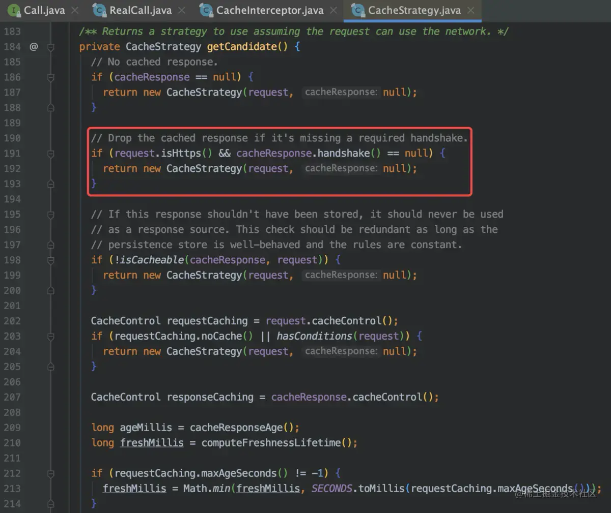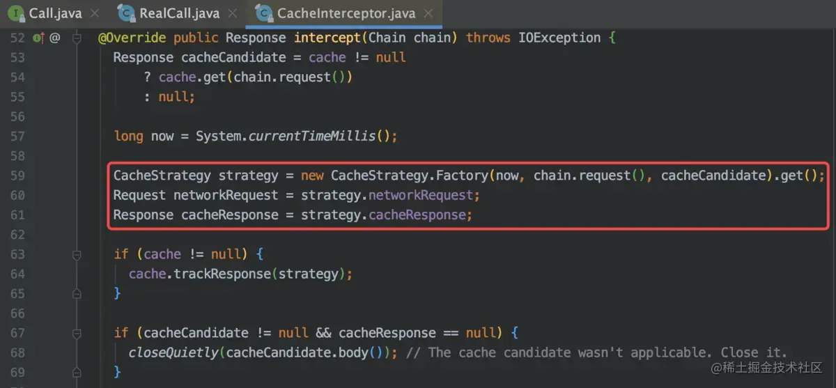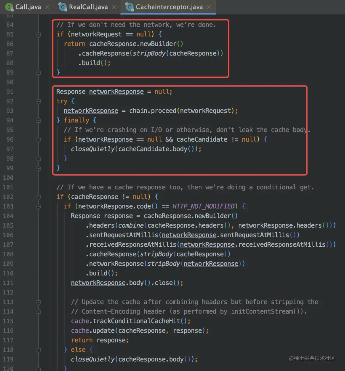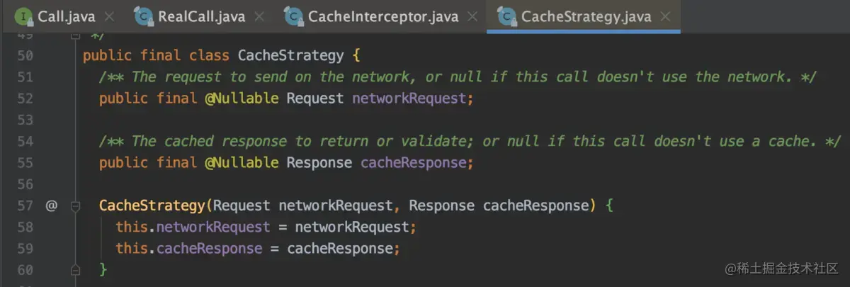 - 从注释的翻译可以看出,networkRequest 对象如果不等于空, 那么代表需要请求一次网络,如果等于空则不需要。而 cacheResponse 对象如果不等于空,那么代表这个缓存是可复用的,如果等于空则不能复用
