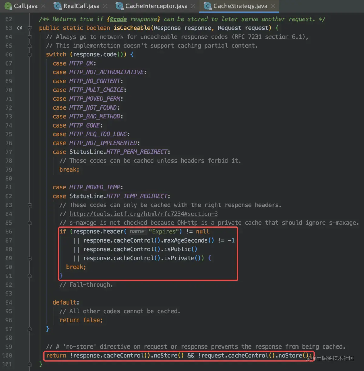- 这个方法主要用来判断缓存是否可用,前提条件是客户端和服务器必须没有禁止缓存,如果响应码是 302 或者 307,则还需要服务器有指定缓存的过期时间又或者服务器有明确允许客户端做缓存,否则这个缓存就是不能被复用的