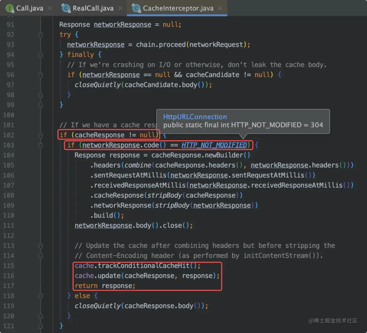 - 就如我们刚刚讲过的,如果本地缓存过期了,那么我们会请求网络来询问服务器是否复用这个缓存,如果服务器返回响应码 304,那么就证明服务器允许了,但是服务器会给我们返回一个空 Body 的 Response 对象,所以我们需要对 networkResponse 中的 Body 替换成 cacheResponse 中的 Body,然后刷新本次请求的缓存,最后再将结果返回回去