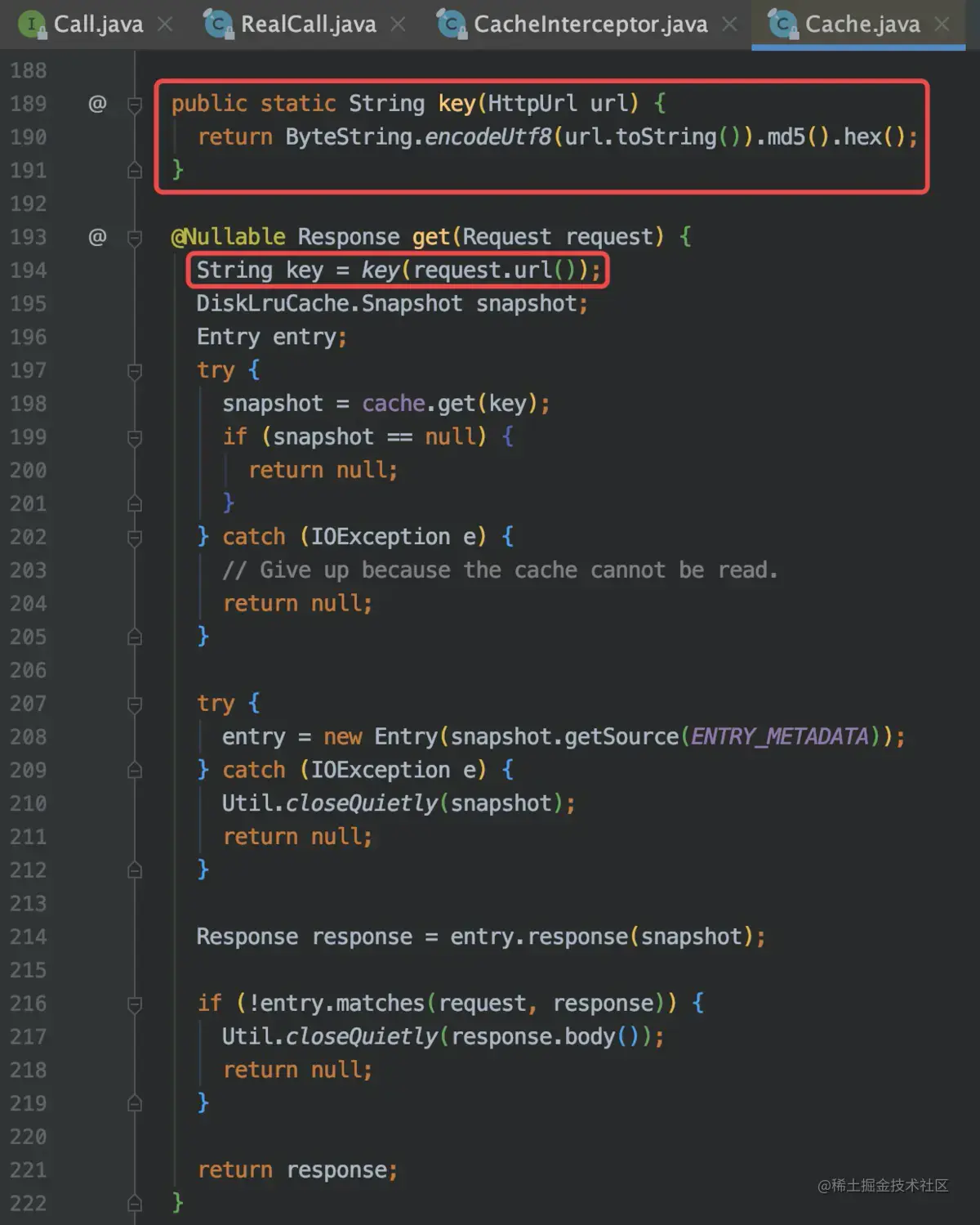 在这里我们可以很直观地看到 OkHttp 的缓存读取方式,直接将整个 Request 对象传入,最后返回一个缓存的 Response 对象