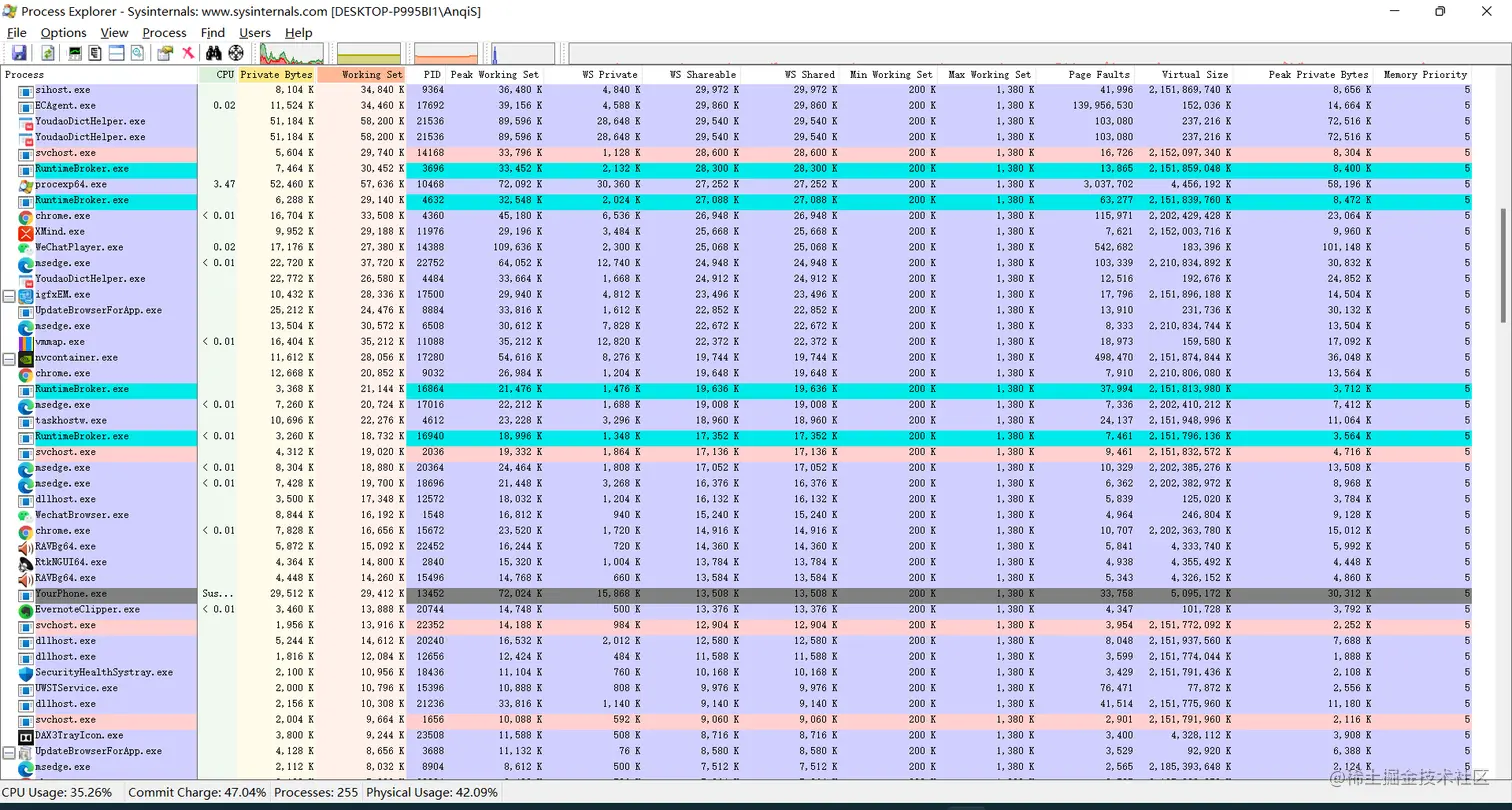 物理内存(working set),含义和 Process Explorer 及任务管理器中相同: