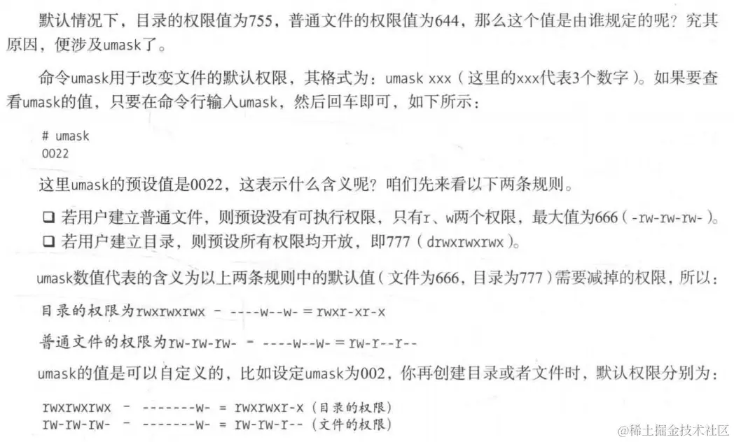 关于umask的计算方法,有的朋友喜欢换算成数字去做减法,比如 rwxrwxrwx - ----w--w-=777-022=755。乍一看这好像没有任何问题,但有时会出错,比如当umask值为033时,如果使用单纯的减法,文件的默认权限则为666-033=633,但实际权限应该为rw-rw-rw- - -----wx-wx=rw-r--r--=644。