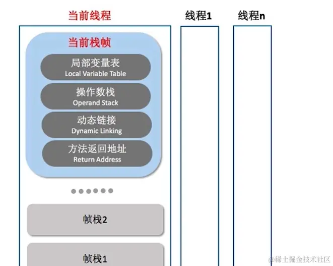 每个 Java 方法在执行的同时会创建一个栈帧用于存储局部变量表、操作数栈、常量池引用等信息。从方法调用直至执行完成的过程,就对应着一个栈帧在 Java 虚拟机栈中入栈和出栈的过程。