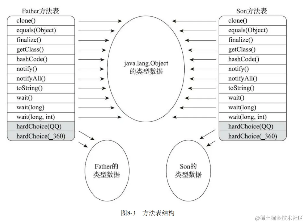 虚方法表中存放着各个方法的实际入口地址。如果某个方法在子类中没有被重写,那子类的虚方 法表中的地址入口和父类相同方法的地址入口是一致的,都指向父类的实现入口。如果子类中重写了 这个方法,子类虚方法表中的地址也会被替换为指向子类实现版本的入口地址。 在图8-3中,Son重写 了来自Father的两个方法(实际上也是Father定义的所有方法),因此Son的方法表没有指向Father类型数据的箭头。但是Son和Father都没有重写来自Object的方法,所以它们的方法表中所有从Object继承来的方法都指向了Object的数据类型。