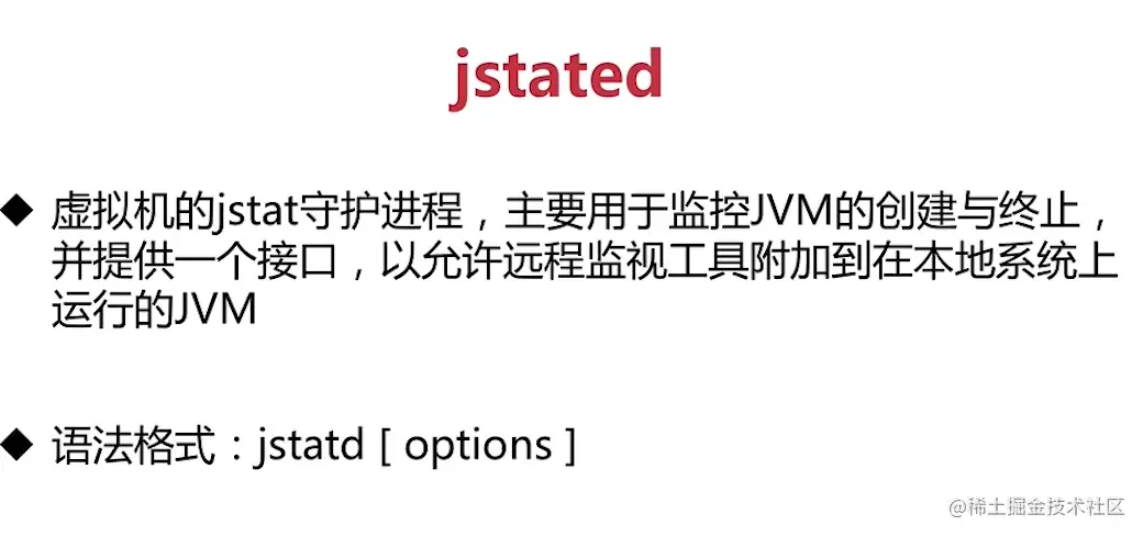 jstat(JVM Statistics Monitoring Tool)是用于监视虚拟机各种运行状态信息的命令行工具。它可 以显示本地或者远程虚拟机进程中的类加载、内存、垃圾收集、即时编译等运行时数据,在没有 GUI图形界面、只提供了纯文本控制台环境的服务器上,它将是运行期定位虚拟机性能问题的常用工具。