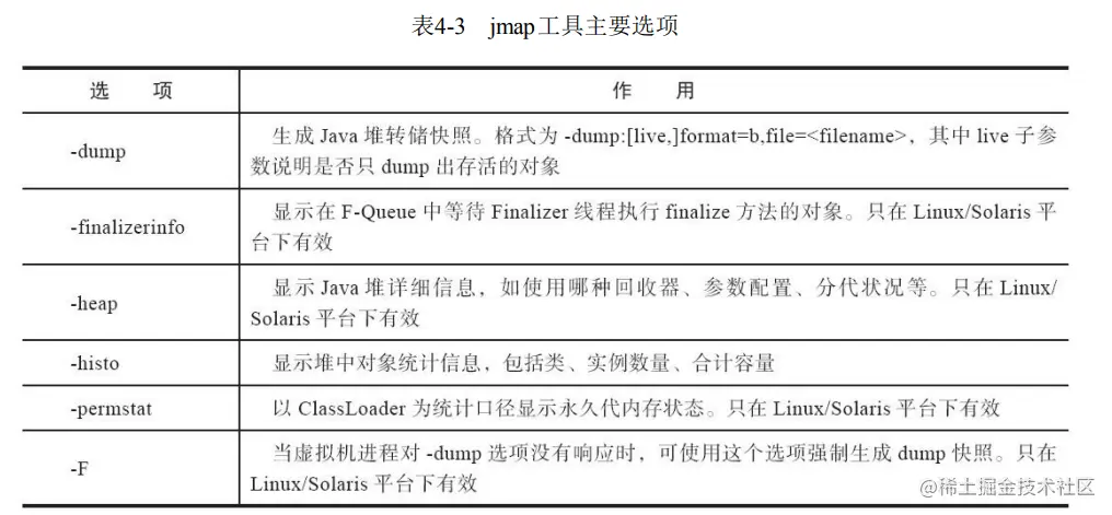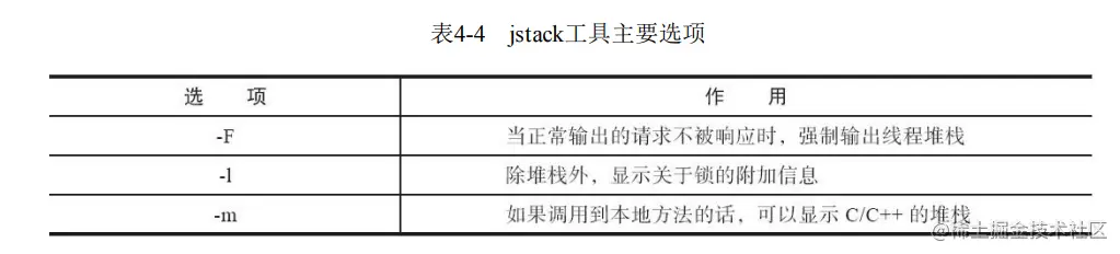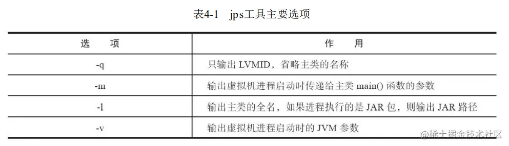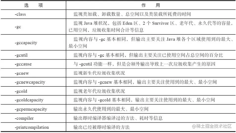 选项option代表用户希望查询的虚拟机信息,主要分为三类:类加载、垃圾收集、运行期编译状 况。详细请参考表4-2中的描述