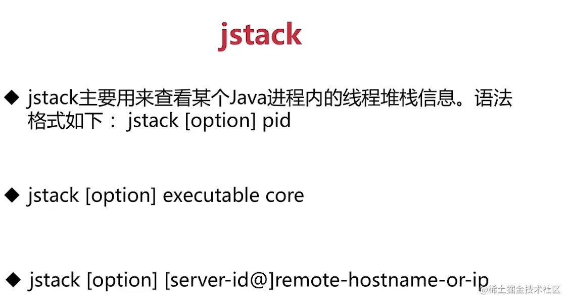 jstack(Stack Trace for Java)命令用于生成虚拟机当前时刻的线程快照(一般称为threaddump或者 javacore文件)。线程快照就是当前虚拟机内每一条线程正在执行的方法堆栈的集合,生成线程快照的 目的通常是定位线程出现长时间停顿的原因,如线程间死锁、死循环、请求外部资源导致的长时间挂 起等,都是导致线程长时间停顿的常见原因。线程出现停顿时通过jstack来查看各个线程的调用堆栈, 就可以获知没有响应的线程到底在后台做些什么事情,或者等待着什么资源。