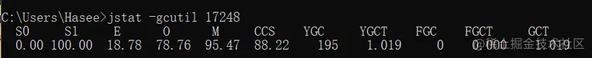 查询结果表明:这台服务器的新生代Eden区(E,表示Eden)使用了18.78%的空间,2个Survivor区 (S0、S1,表示Survivor0、Survivor1)分别使用了0%和100%,老年代(O,表示Old)和元数据区(M,表示 Meta)则分别使用了78.76%和95.47%的空间。程序运行以来共发生Minor GC(YGC,表示Young GC)195次,总耗时1.019秒;发生Full GC(FGC,表示Full GC)0次,总耗时(FGCT,表示Full GC Time)为0秒;所有GC总耗时(GCT,表示GC Time)为1.019秒。