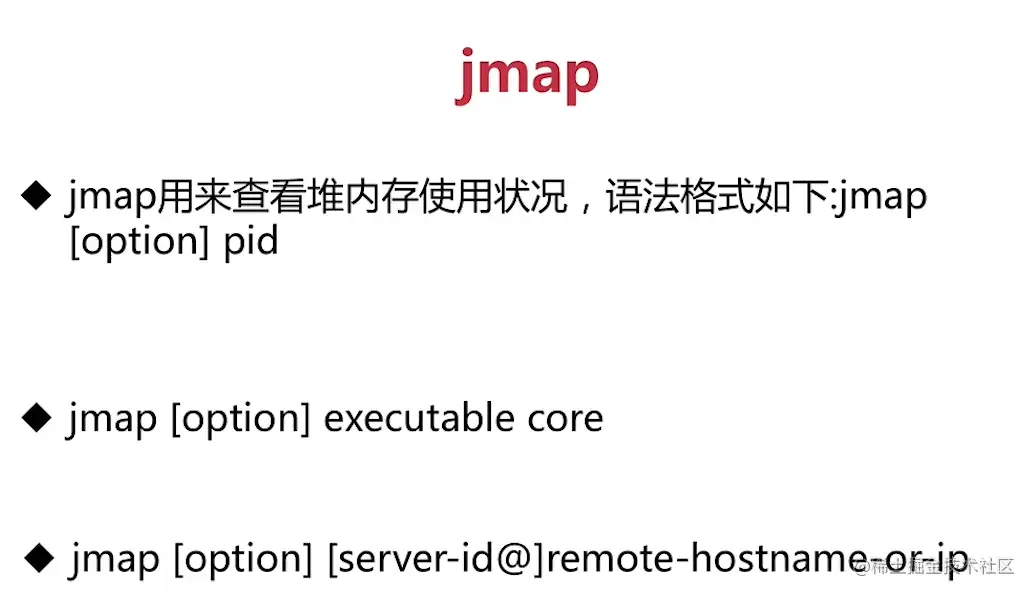 jmap的作用并不仅仅是为了获取堆转储快照,它还可以查询finalize执行队列、Java堆和方法区的 详细信息,如空间使用率、当前用的是哪种收集器等。