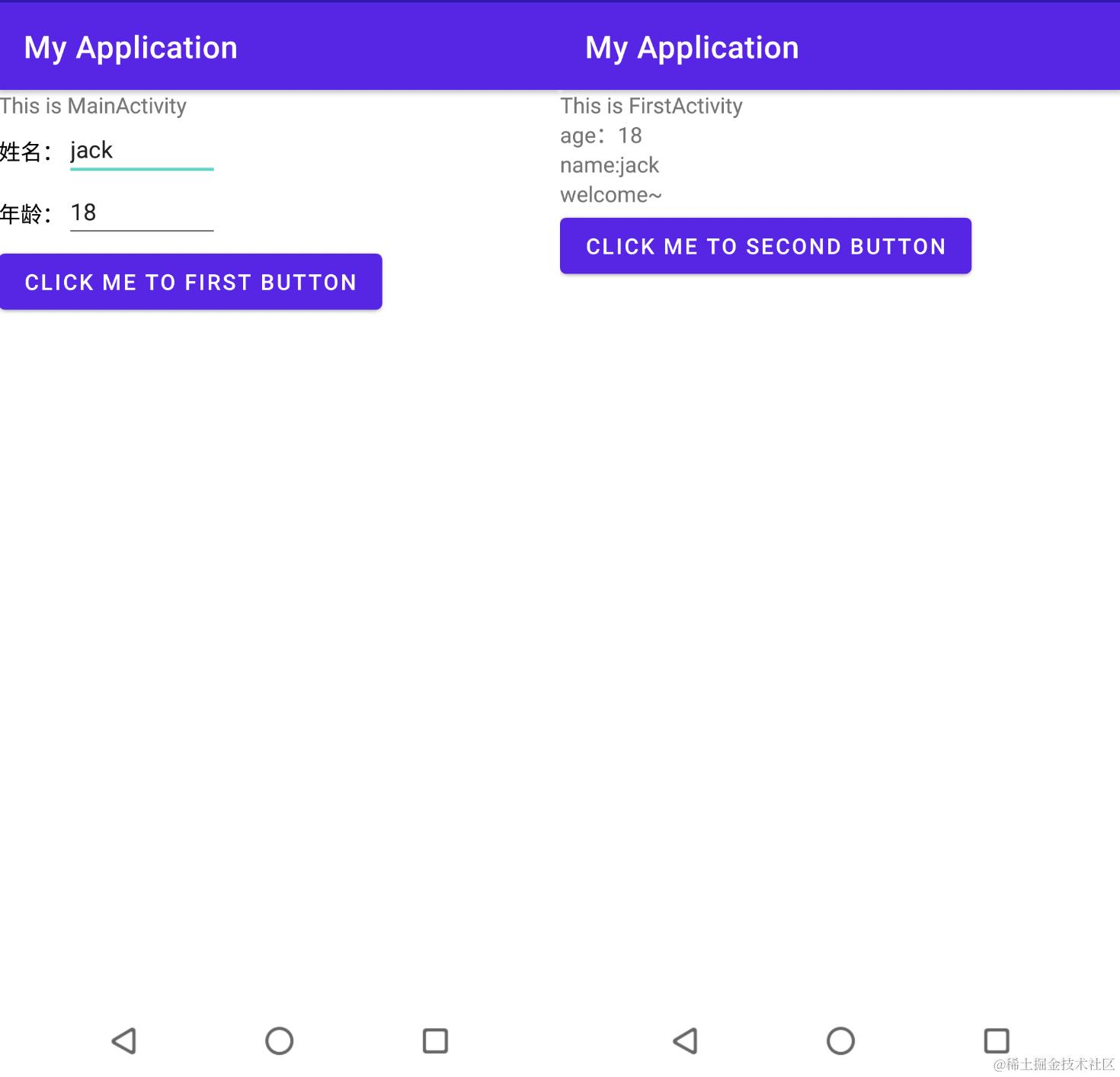 通过一个简单的例子来介绍拦截跳转的应用场景:在MainActivity中有两个文本框分别用来输入name和age,点击Button后打开模块first_library模块中的FirstActivity:
