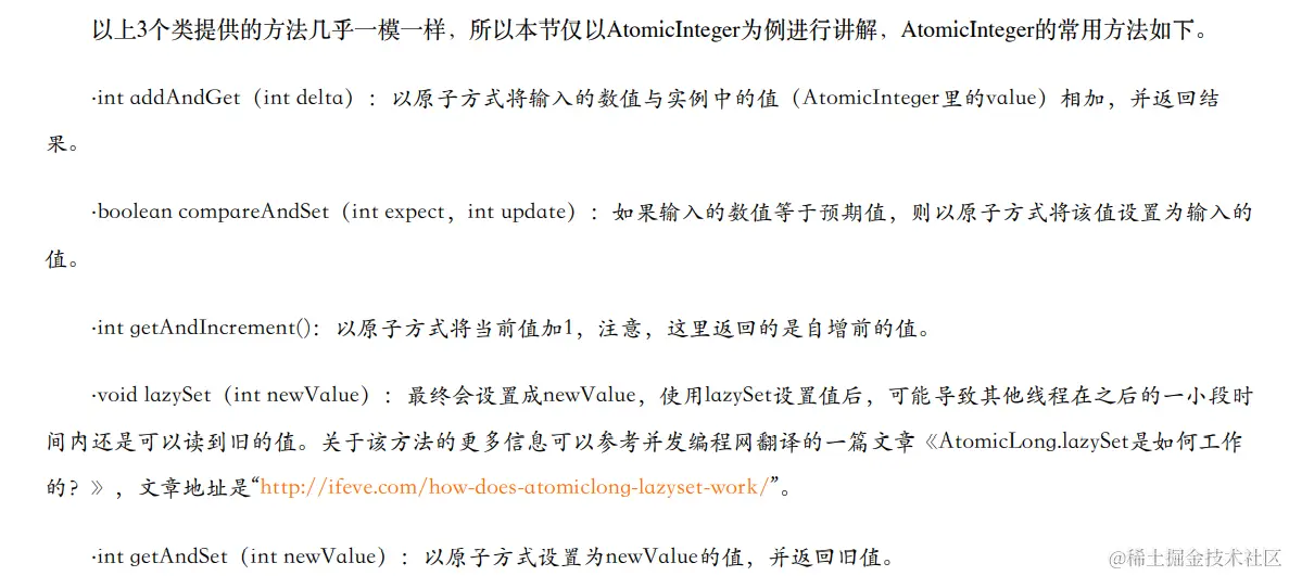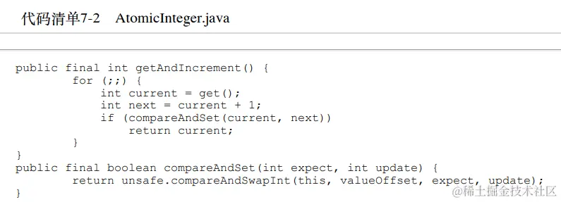源码中for循环体的第一步先取得AtomicInteger里存储的数值,第二步对AtomicInteger的当前数值进行加1操作,关键的第三步调用compareAndSet方法来进行原子更新操作,该方法先检查当前数值是否等于current,等于意味着AtomicInteger的值没有被其他线程修改过,则将Atomiclnteger的当前数值更新成next的值,如果不等comparcAndSet方法会返回false,程序会进入for循环重新进行compareAndSet操作。
