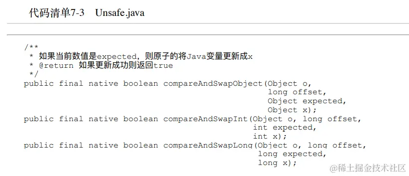 Atomic包提供了3种基本类型的原子更新,但是Java的基本类型里还有char、float和double等。那么问题来了,如何原子的更新其他的基本类型呢?Atomic包里的类基本都是使用Unsafe实现的,让我们一起看一下Unsafe的源码,如代码清单7-3所示。