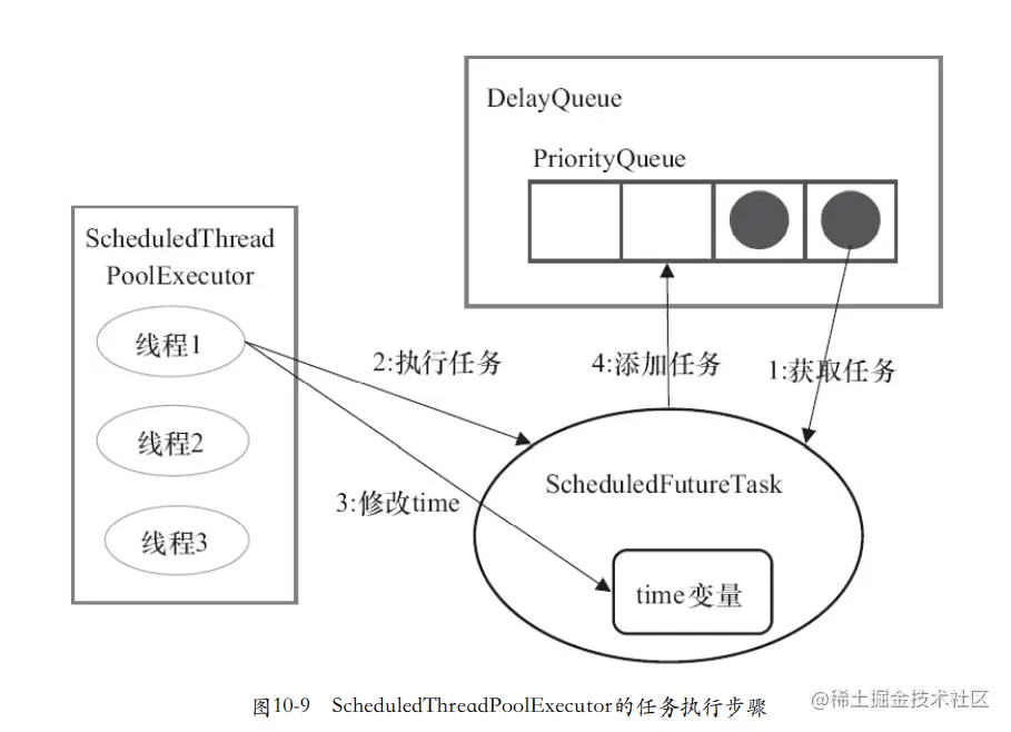 - 线程1修改ScheduledFutureTask的time变量为下次将要被执行的时间。