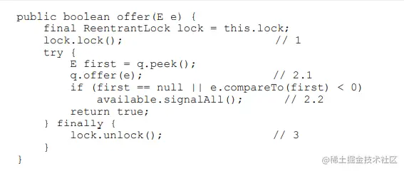 - 获取PriorityQucuc的头元素(2.3.1) ;如果PriorityQucue不为空,则唤醒在Condition中等待的所有线程(2.3.2)