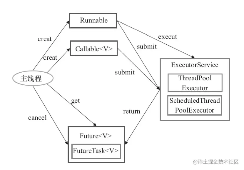 主线程首先要创建实现Runnable或者Callable接口的任务对象。工具类Executors可以把一个Runnable对象封装为一个Callable对象((Executors.callable (Runnable task)或Executors.callable (Runnable task,Object resule) )。