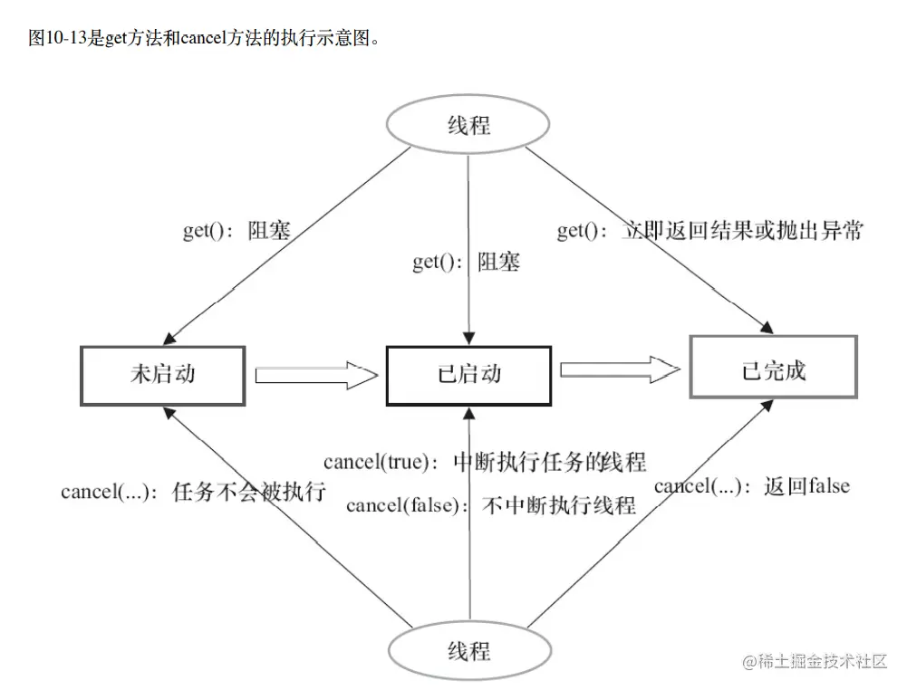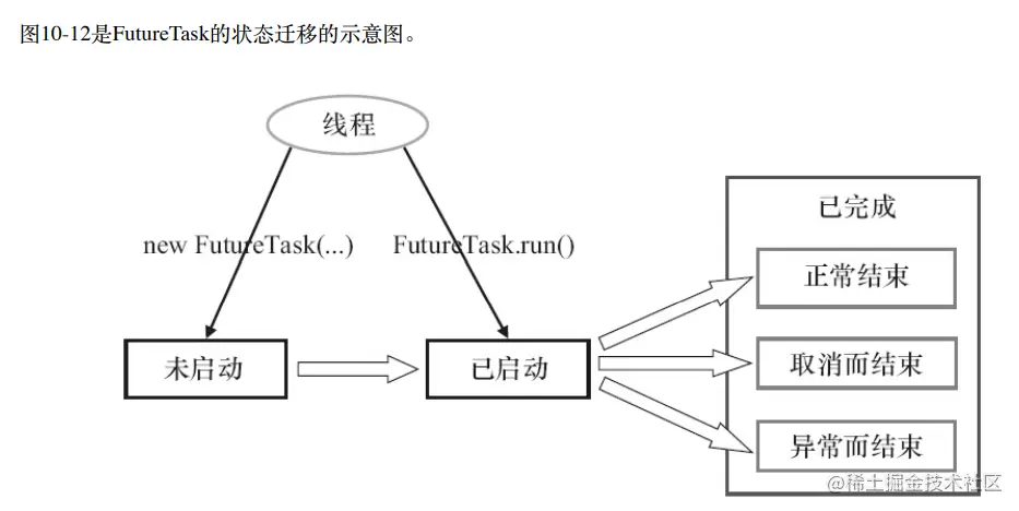 - 已完成。FutureTask.run()方法执行完后正常结束,或被取消(FutureTask.cancel (...)),或执行FutureTask.run()方法时抛出异常而异常结束,FutureTask处于已完成状态。